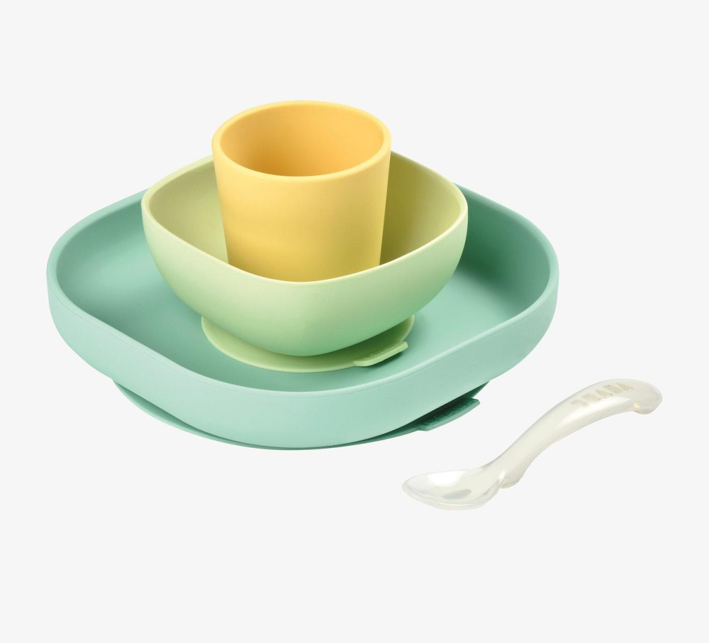 Силиконовый набор посуды для кормления от французской марки Beaba. В комплекте: стакан, ложка, 2 тарелки (маленькая 300 мл, большая 600 мл). Тарелки с присосками для крепления к столу или к стульчику для кормления.  Удобная форма, стойкий к любому воздействию материал. Рекомендуемый возраст: с 4 месяцев.